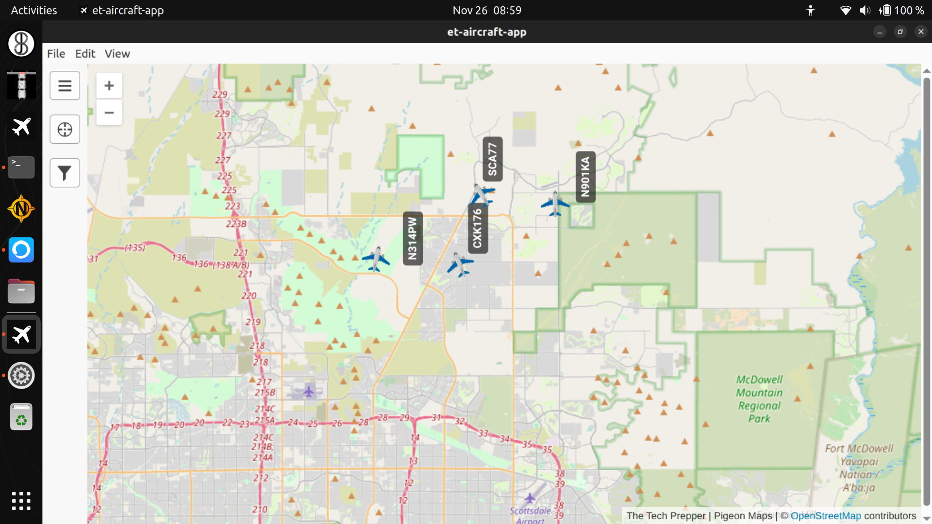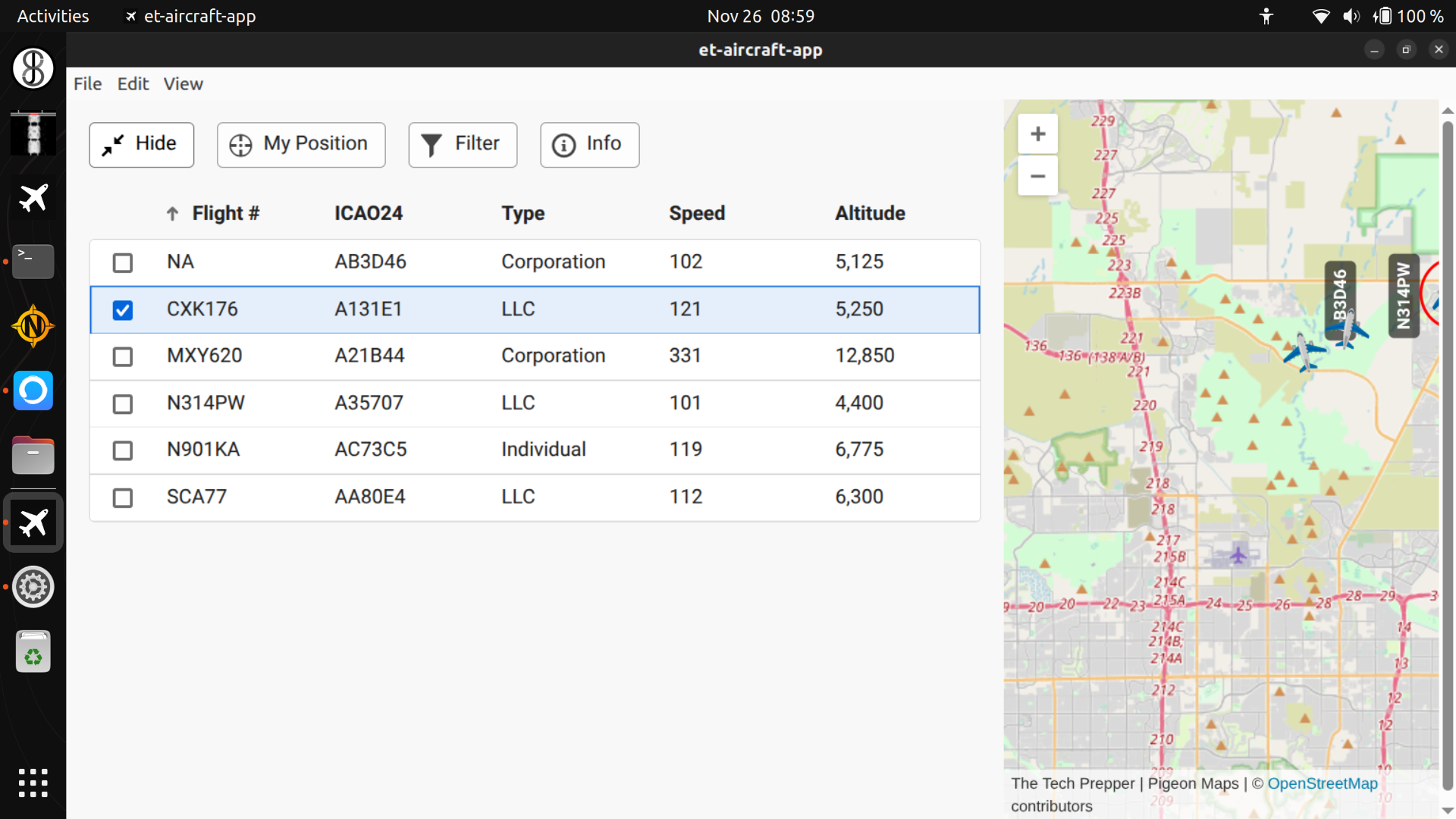 et-aircraft-app is a custom graphical application to make offline aircraft tracking simpler to use. Simply plug in a Supported SDR and click on the airplane icon in the launcher on the left side of the Desktop.