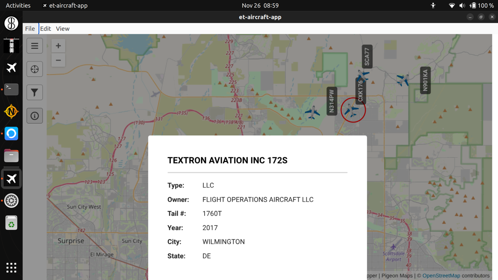 Clicking on the aircraft places a red tracking ring around it. An “info” icon appears on the left-hand side of the application if more information is known about the aircraft in the offline FAA database. Clicking on the info icon (i button) displays this information.