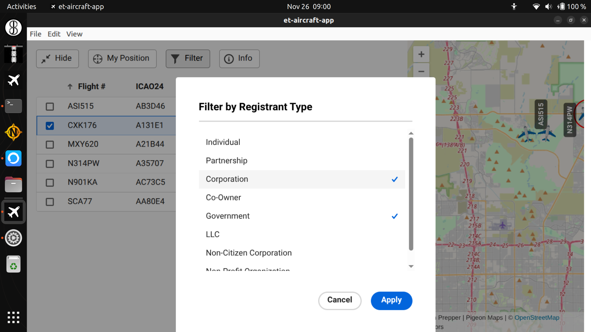 Lastly, you can filter the aircrafts displayed on the map and table by clicking on the “filter” (funnel icon) button.
